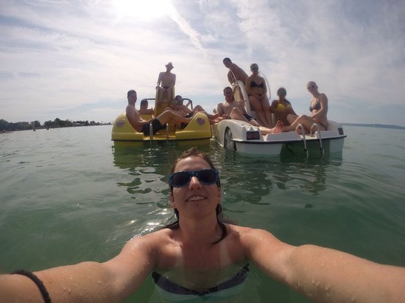 Untergebracht waren wir im Hotel Napfeny, nur wenige Schritte vom See entfernt. Tagsüber hielten wir uns im Strandbad auf - egal ob Tretbootfahren, Volleyball spielen, schwimmen oder einfach nur relaxen - es war für jeden etwas dabei! Am Abend gingen wir der Partymeile am Balaton entlang, schlürften einige Cocktails und tanzten bis in die frühen Morgenstunden! :)