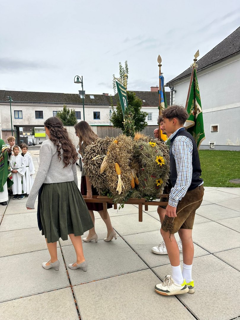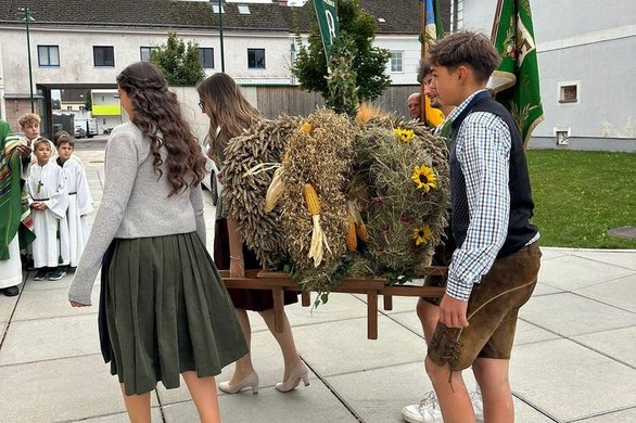 Wir unterstützen das alljährliche Erntedankfest, indem wir die Erntedankkrone flechten und die Agape übernehmen.